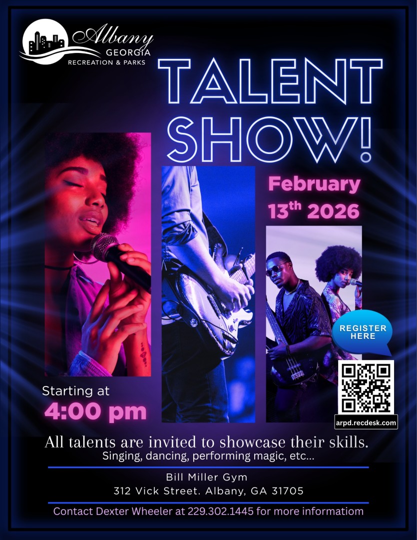 Join us for an exciting and fun-filled Talent Show on February 13th, 2026, at 4:00 p.m. at Bill Miller Gym, located at 312 Vick Street, Albany, Georgia 31707. This event is open to everyone, and all ages are welcome to participate and attend!