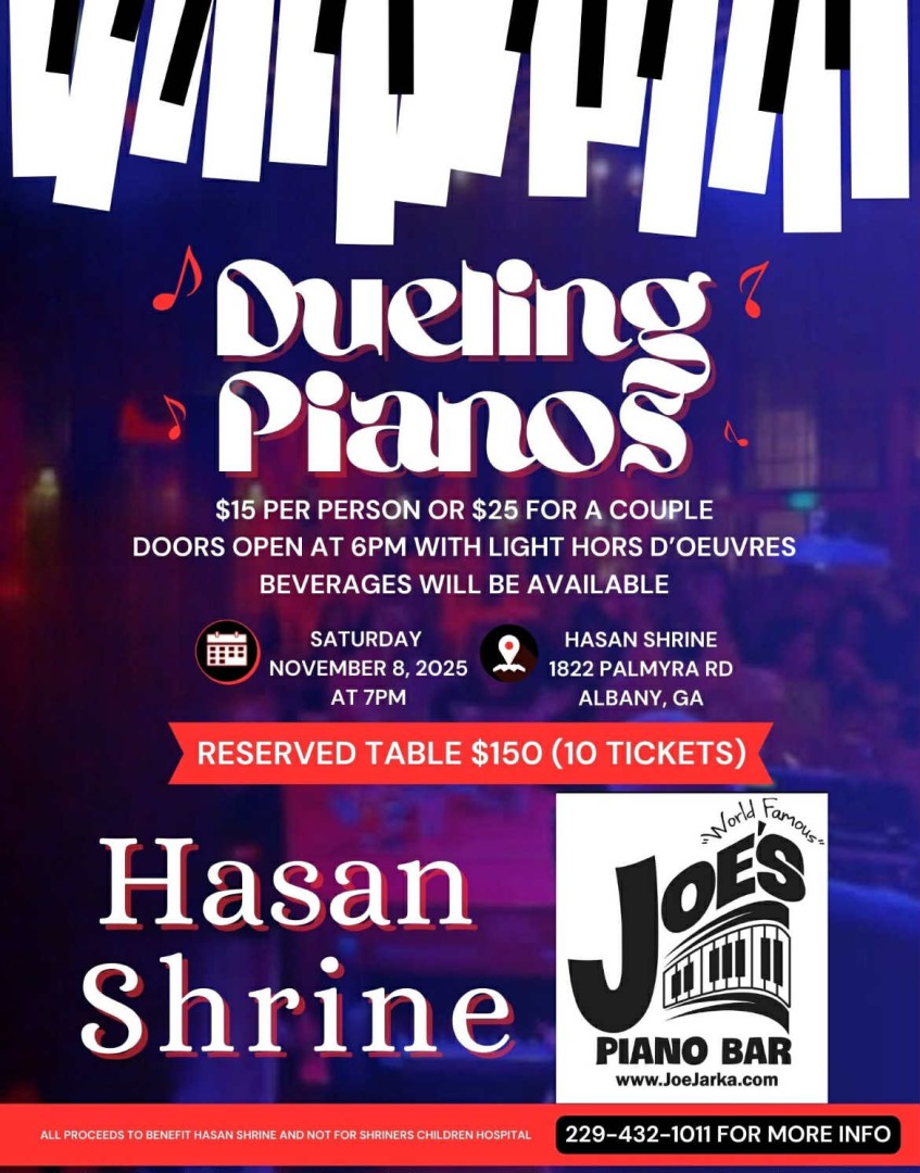 Home Dueling Pianos Dueling Pianos1822 Palmyra Rd Georgia United StatesDetailsOpen in Google Maps Map Hasan Shrine 1822 Palmyra Rd, , GA (229) 432-1011 Overview Dueling Piano by Joe Jarka. Light Hors D'oeuvres, Beverages available. Great way to celebrate a birthday or just a great night out, while supporting your local Shriners. Nov 8 7:00 PM Save Related Partner Doublegate Country Club Doublegate Country Club3800 Old Dawson Road Albany, Georgia United StatesDetailsOpen in Google Maps Map 3800 Old Dawson Road, Albany, GA (229) 436-6501 Learn More Website
