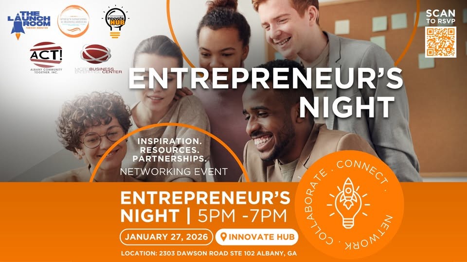 Albany Community Together, The Launch Room, Innovate Hub, O’Neal Consulting & Training Services, and MicroBusiness Enterprise Center are teaming up for Entrepreneur’s Night — a powerful evening of connection, collaboration, and community you don’t want to miss!