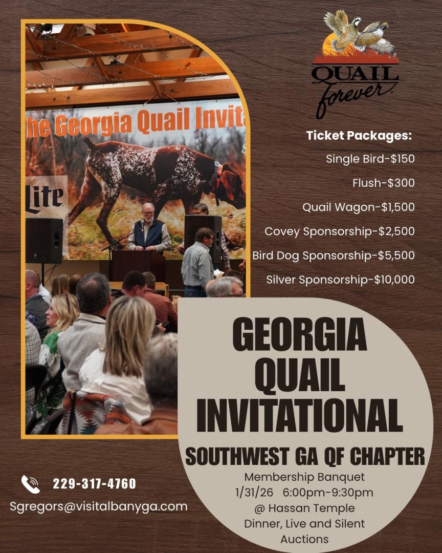 The Southwest Georgia Chapter of Quail Forever invites you to participate in the finest quail hunting in the nation. By attending this celebration, you