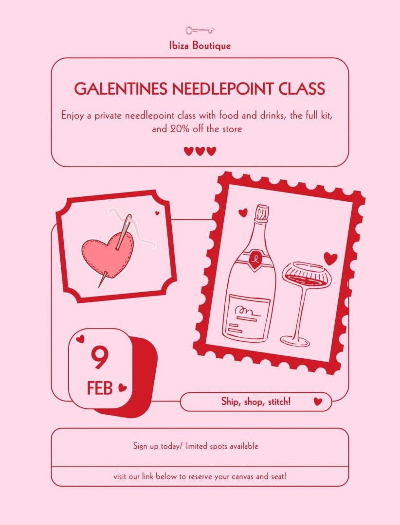 Come join us for our galantine's needlepoint class February 9th! The tickets will include the full kit, food & drinks, 20% off the store starting at 6pm and the class will start at 6:30! This class is perfect for beginners or if you just want a fun experience! Seats will be limited so make sure to grab yours while you can!