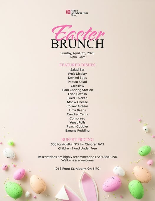 Home Hilton's Easter Brunch Hilton's Easter Brunch101 S Front St Georgia United StatesDetailsOpen in Google Maps Map Hilton Garden Inn 101 S Front St, , GA (877) 504-0075 Overview Don't forget to make your Easter Brunch reservation here at the Hilton Garden Inn Albany! Come enjoy good food and good service!! Apr 5 12:00 PM –3:00 PM Save Related Partner Hilton Garden Inn Hilton Garden Inn101 S Front Street Albany, Georgia United StatesDetailsOpen in Google Maps Map 101 S Front Street, Albany, GA (229) 888-1590 Learn More Website