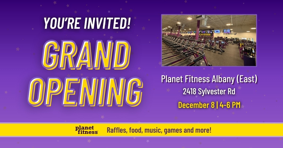 You’re invited to the Grand Opening celebration of the brand-new Planet Fitness in Albany at 2418 Sylvester Rd! Join us on December 8 from 4–6 PM for giveaways, free day passes, HydroMassage™ trials, local vendor samples, and swag. Meet our friendly staff and explore our clean, spacious club filled with state-of-the-art equipment. We can’t wait to welcome you to the newest Judgement Free™ space in town!