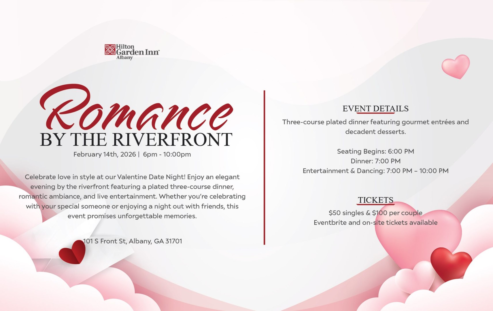 < Back Romance by the Riverfront by The Hilton Romance by the Riverfront by The Hilton101 S Front St. Georgia United StatesDetailsOpen in Google Maps Map Hilton Garden Inn 101 S Front St., , GA (229) 888-1590 Overview Celebrate love in style at The Hilton. Feb 14 6:00 PM –10:00 PM Save Related Partner Hilton Garden Inn Hilton Garden Inn101 S Front Street Albany, Georgia United StatesDetailsOpen in Google Maps Map 101 S Front Street, Albany, GA (229) 888-1590 Learn More Website